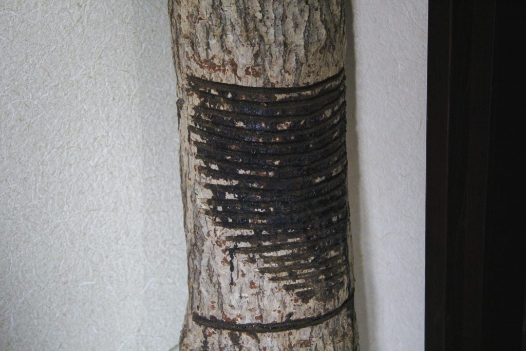 漆の木を傷つけてその樹液を使います。漆の木は10〜15年ほど育てても、1本から採れる量は牛乳瓶1本分(約200cc)程度しかなく、その時点で伐採することになるため、とても貴重な素材なのです。