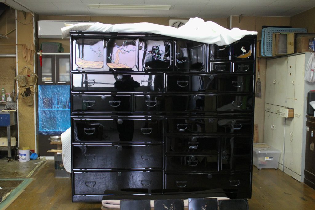 このタンス使用された漆の量は約100万円になるそうです。。。漆自体が貴重な素材ですが、最も大きなコストを占めるのは職人の手間です。仕上がりは、鏡のように自分の姿が映り込むほどの美しさであった。