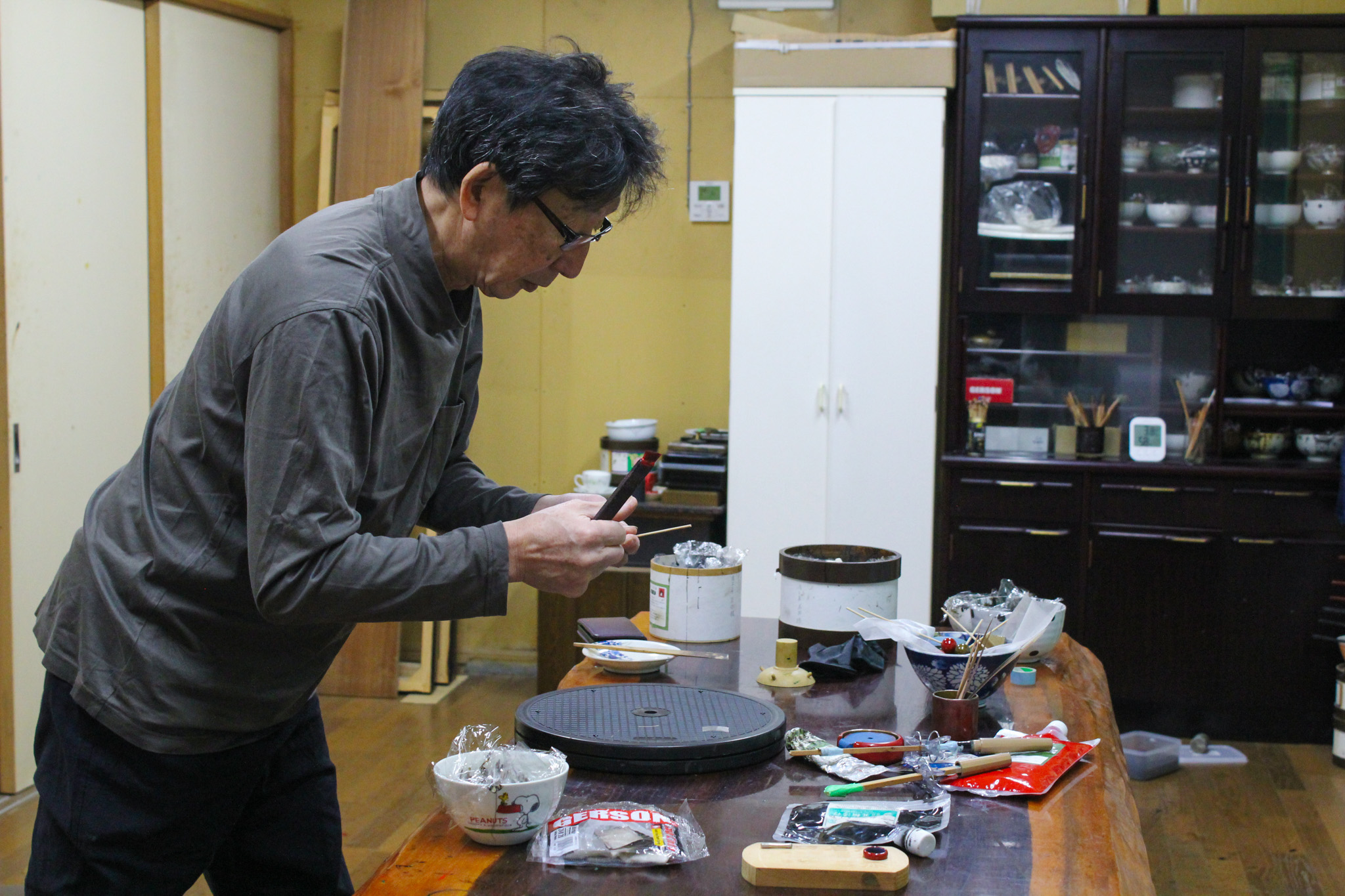 近松敏夫さんは、伝統工芸士であり40年以上漆職人として研鑽を積み重ねてきたベテランです。7代にわたる漆職人の家系に生まれ、お祖父さんから数えて3代目となります。