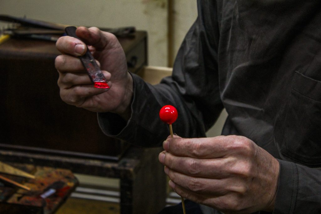 刷毛で塗った際履け目が出ないように、また埃がついてたら一つ一つ針で拾う。